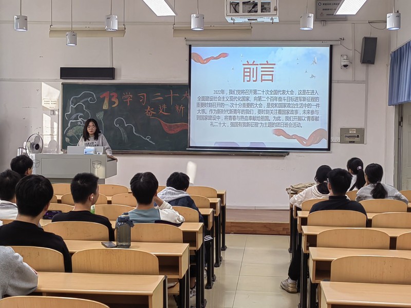 全班共34名同学参加了主题班会活动。班会在主持人陈焯对中共二十大的介绍中拉开序幕,随后共同演唱了《没有共产党就没有新中国》。演唱过后,由陈焯从“二十大新征程”“中坚力量”“牢记嘱托”“砥砺奋斗”四个层面来讲述“个人如何将青春奋斗与国家奋斗的伟大历程相结合,让青春在时代背景下绽放绚丽之花”。同学们也了解到了中国共产党的中心任务、基本原则,对中国共产党的伟大贡献做出了高度赞扬。